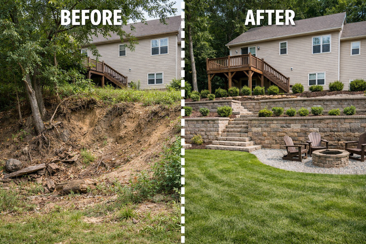 This area suffered from erosion and an unstable slope, posing risks and limiting usable space. We consulted with the homeowner to design a durable and aesthetically pleasing retaining wall solution that would address both functionality and curb appeal.